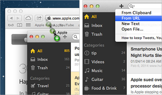 User can also keep data from other applications, such as Twitter, Pocket, and ReadKit, with drag & drop. When saving Tweet, especially, included links are stored together as well.